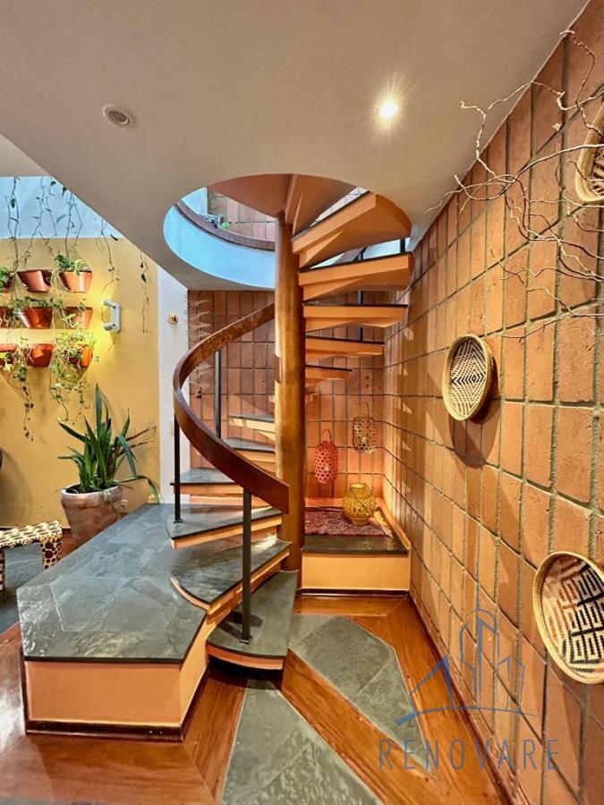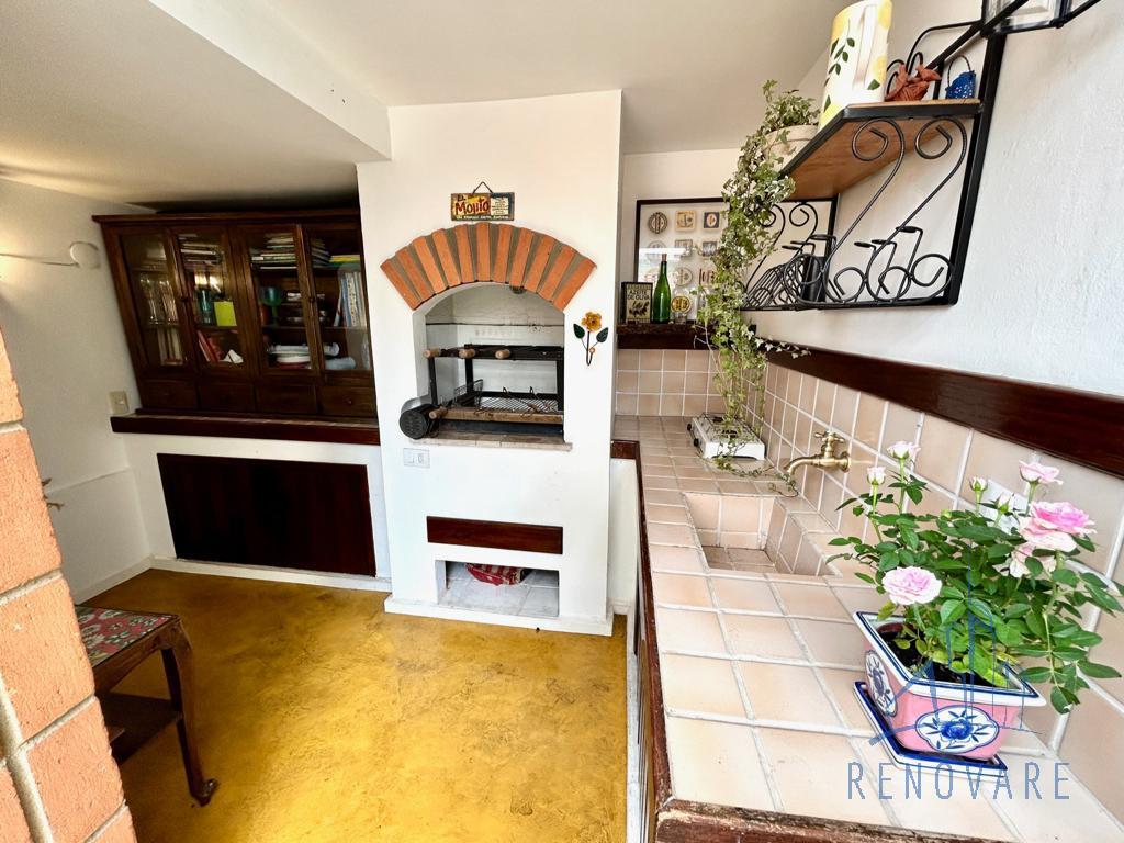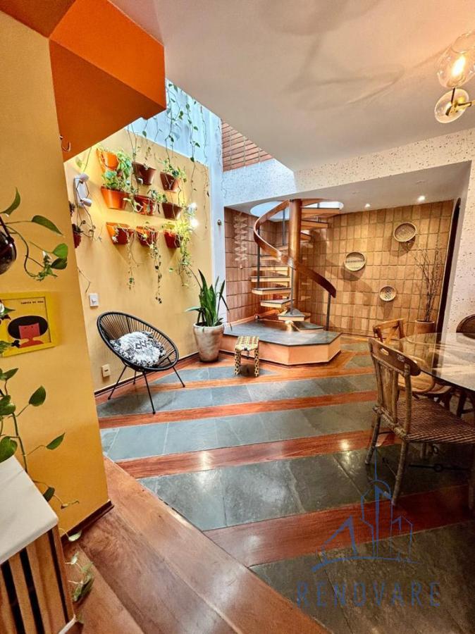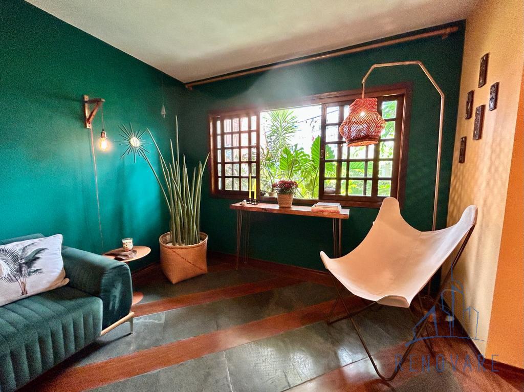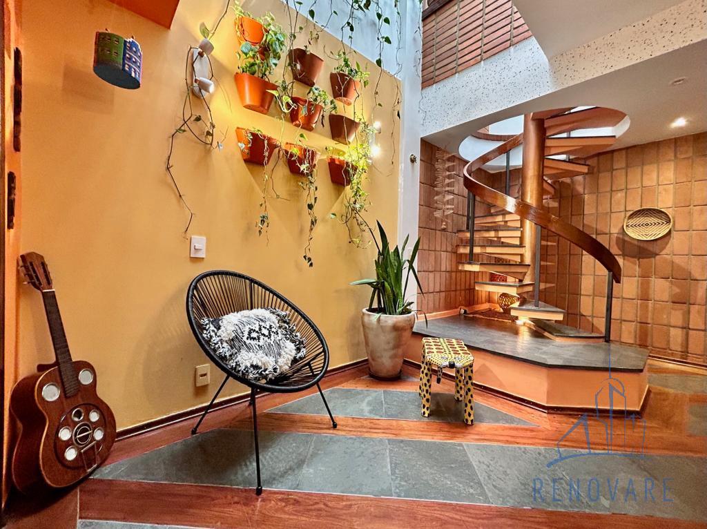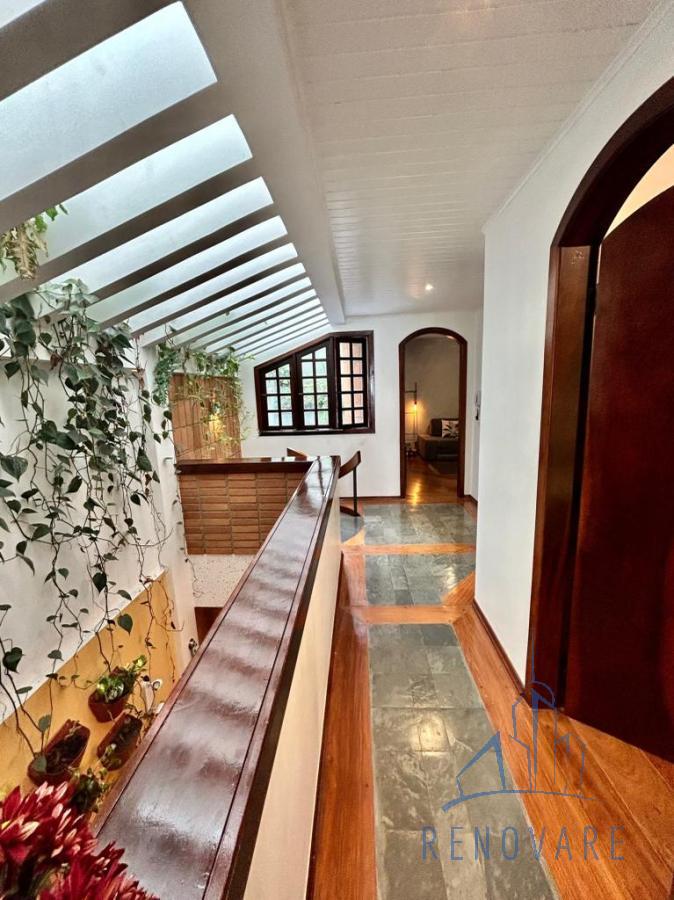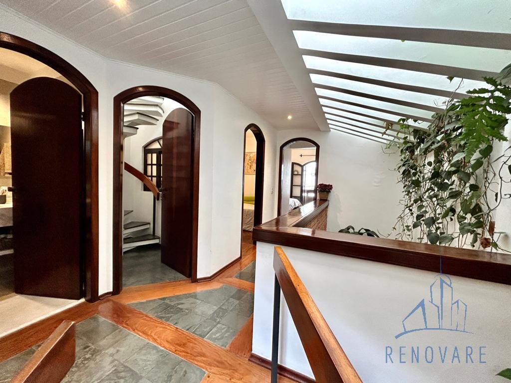O imóvel tem paisagismo exuberante, escada em caracol, cômodos com piso em madeira e também madeira com ardósia, banheiros com box de vidro e pias com gabinete de granito, cozinha toda azulejada com móveis planejados, pia e balcão em granito e jardim externo com área coberta.
